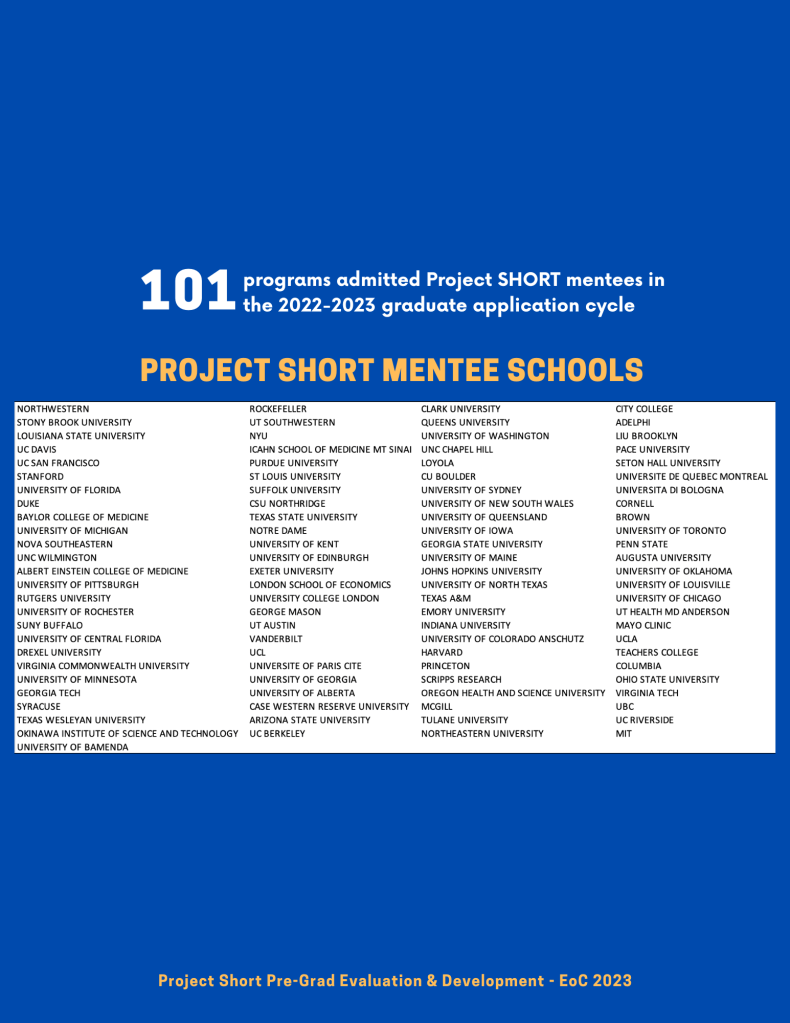 As a co-director of evaluation and development, I wanted to share a brief report from the EoC surveys. Overall, Project SHORT’s services maintain high ratings from mentees and mentors, and most survey respondents received grad school admission offers. Project SHORT continues to close gaps in the hidden curriculum of applying to graduate school, and it is an incredibly rewarding organization to be a part of.