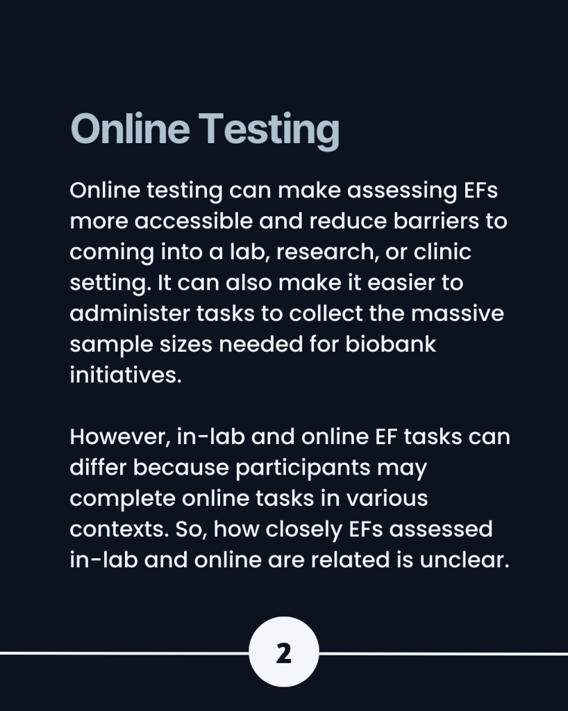 Online testing can make assessing cognitive constructs like executive functions (EFs) more accessible and reduce barriers to coming into a lab, research, or clinic setting. It can also make it easier to administer tasks to collect the massive sample sizes needed for biobank initiatives.