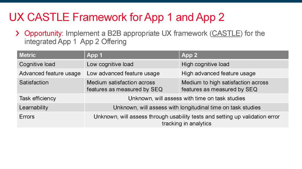 Ask: Implement usability benchmarking to understand each application’s usability baseline, assess what features overlap between the products, and create recommendations for future research and the integrated product roadmap.